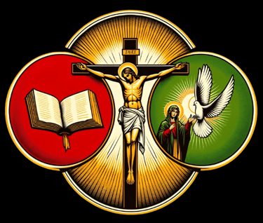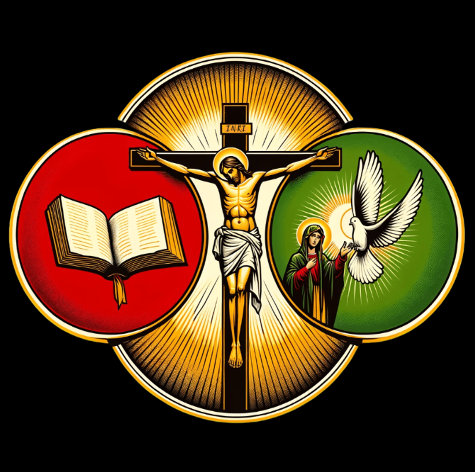 Tre colori – rosso, giallo e verde – si uniscono in un ritmo di vita divina, come un semaforo spirituale che guida il cammino dell’anima verso la Volontà di Dio. Al centro, nella luce dorata, c’è Gesù Crocifisso e Risorto, il cuore di tutto. Dietro di Lui, il bianco eucaristico evoca l’Ostia e il Pane del Cielo: il segno della comunione perfetta, del Dio che si dona e rimane presente.